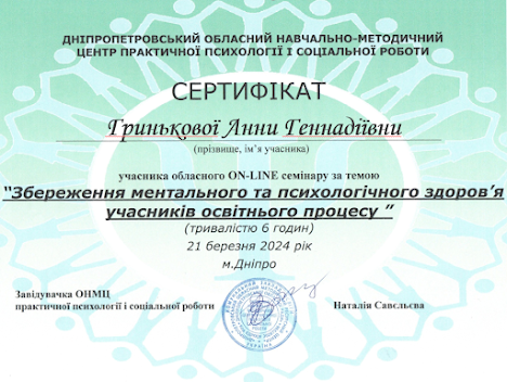 Участь в обласному семінарі «Збереження ментального та психологічного здоров’я учасників освітнього